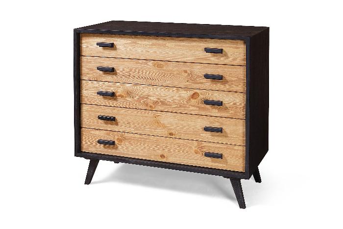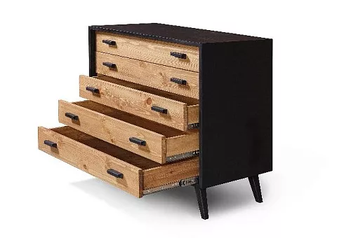 Комод выполнен из массив сосны. Имеет 5 выдвижных ящиков. Высота ножек 15 см. Все выдвижные ящики серии Эрика на шариковых направляющих,двери - европетли , по-умолчанию металлические ручки, возможно изготовление без отверстий, черным цветом - нанесён чёрный матовый лак. Задние стенки и донышки ящичков - наборная вагонка, сосна. Тон мебели может отличатся от фотографии на сайте.