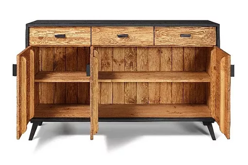 Комод выполнен из массив сосны. 3 распашные двери, 3 выдвижных ящика. Высота ножек 15 см. Все выдвижные ящики серии Эрика на шариковых направляющих,двери - европетли , по-умолчанию металлические ручки, возможно изготовление без отверстий, черным цветом - нанесён чёрный матовый лак. Задние стенки и донышки ящичков - наборная вагонка, сосна. Тон мебели может отличатся от фотографии на сайте.