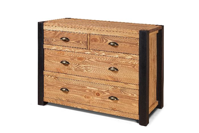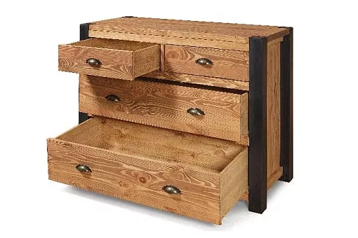 Комод выполнен из массива сосны. Имеет 4 выдвижных ящика. В комплекте ручки "Ракушки", возможно изготовление без отверстий. Массив сосны. Задние стенки и донышки ящичков - наборная вагонка, сосна.
