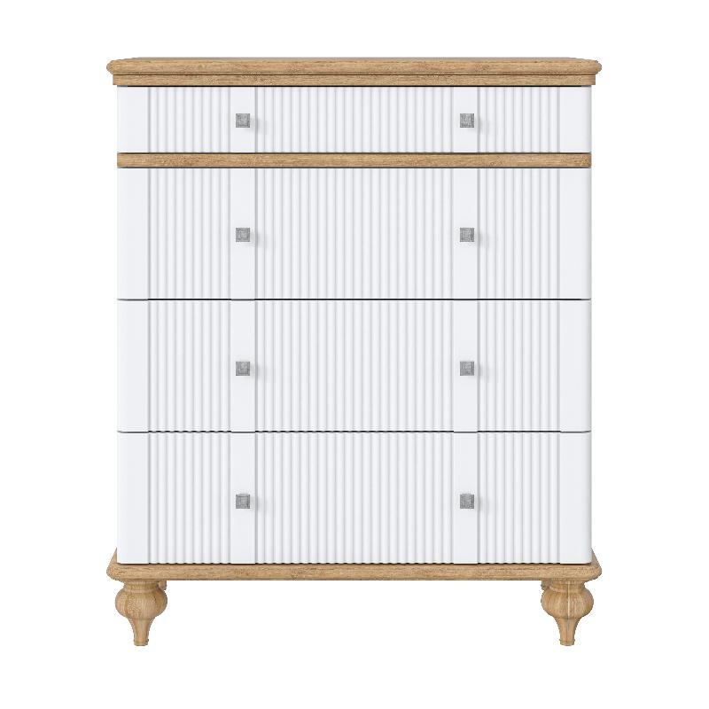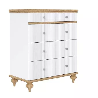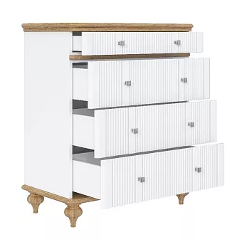 Комод оснащен четырьмя ящиками. Фурнитура на ящиках с доводчиками. Высокие ножки обеспечивают оптимальный доступ при уборке.