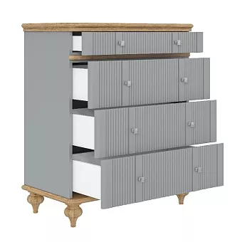 Комод оснащен четырьмя ящиками. Фурнитура на ящиках с доводчиками. Высокие ножки обеспечивают оптимальный доступ при уборке. Особенности Размеры 83,8 x 99,8 x 45,7 см; Из массива сосны; Вес изделия 58 кг. Цвета отделки: «белый лак/антик 24», «серый 7042/антик 24»; 4 ящика; Фурнитура Направляющие - HAFELE (Германия), скрытого монтажа со встроенным демпфером (доводчиком плавного закрывания); Ручки - Giusti (Италия) стиль классика, имеют форму квадрата, материал металл, цвет серебро состаренное; Особенности покрытия Поверхности изделия обработаны лаками и красками, которые выгодно подчеркивают естественную красоту натуральной древесины. Таким образом обеспечивается защита от излишней влаги, появления плесени и грибков. Фотографии могут не передавать точный цвет изделия.