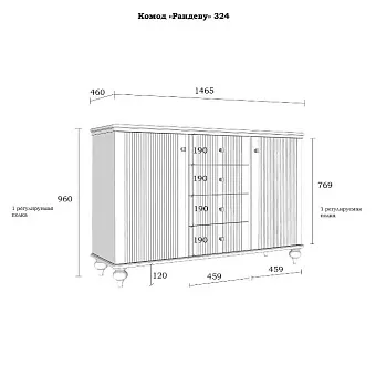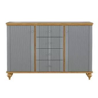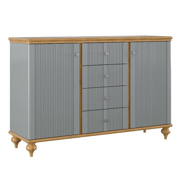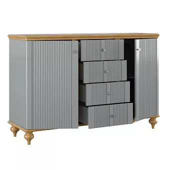 Комод оснащен двумя распашными дверками с полками внутри и четырьмя ящиками. Фурнитура на дверях и ящиках с доводчиками. Высокие ножки обеспечивают оптимальный доступ при уборке.