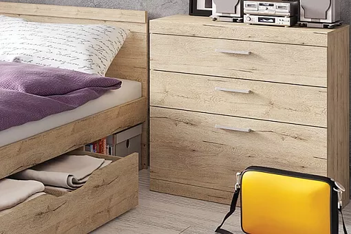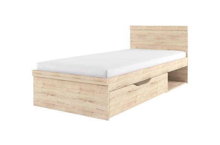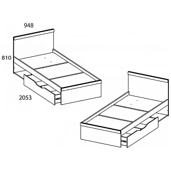 Кровать 90 OSKAR – односпальная, размер спального места – 900*2000 мм (ширина – 948 мм, глубина – 2053 мм). Конструкция кровати представляет собой изголовье и изножье прямоугольной формы с декоративными планками из ЛДСП, царги, вместительный выдвижной ящик, открытую нишу, основание из щитов ЛДСП.