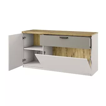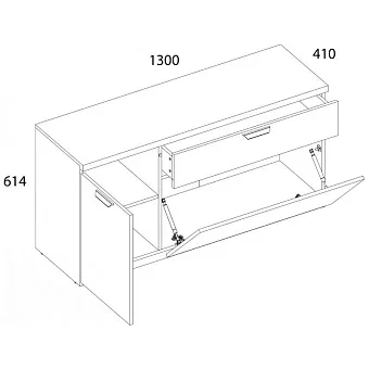 Тумба RTV 2D1S MODERN – более компактная модель для тв-зоны, если сравнивать с тумбой RTV 2D2S MODERN. Имеет меньшую ширину – 1300 мм. Конструкция тумбы RTV 2D1S прямая, представляет два раздельных отделения за глухими дверями (2D), один выдвижной ящик (1S). Одна дверь распашная (отделение с полкой ЛДСП) – крепится на петли к боковому корпусу изделия, одна дверь откидная – крепится на петли и газлифты к корпусу изделия. Элемент может устанавливаться как самостоятельный предмет мебели, в комбинации с другими предметами. А более интересно и стильно данный предмет мебели будет смотреться в общем наборе с такими позициями как шкаф навесной 1D/130-40, панель стеновая 130, полка консольная 130, шкафная группа с глубиной 400 мм и высотой 2300 мм.