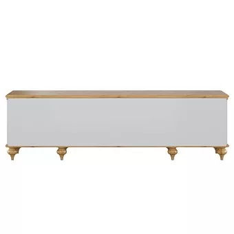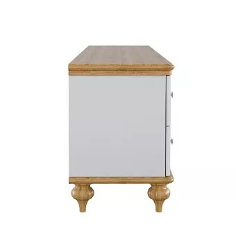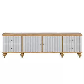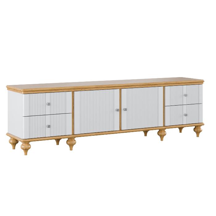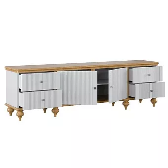 Тумба ТВ оснащена четырьмя выдвижными ящиками и двумя полками за распашными дверями. Фурнитура на ящиках и дверях с доводчиками. Высокие ножки обеспечивают оптимальный доступ при уборке.