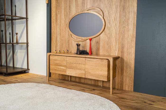 Мебель выполнена из массива дуба с сохранением естественной фактуры древесины. Отделка поверхности выполнена с помощью масла на водной основе, нанесенного втиранием, может быть изготовлена в нескольких цветах на выбор: 10 цветов масел OSMO и 3 цвета эмали.