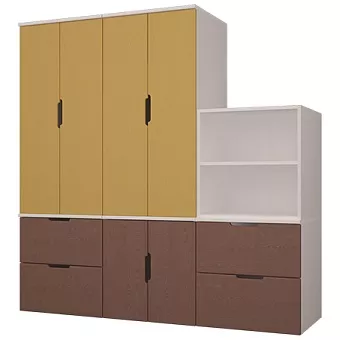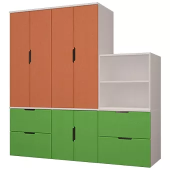Набор мебели для детской Тимберс Кидс изготовлен полностью из бессучковой сосны высокого качества. Корпус изготавливается в белом цвете, варианты цветов фасадов: белый, коричневый, жёлтый, оранжевый, розовый, голубой, зелёный, крем, пепельный. Возможно комплектование фасадами без вырезной ручки. Полки настенные и декор приобретается отдельно. Фотографии могут не передавать точный цвет изделия.