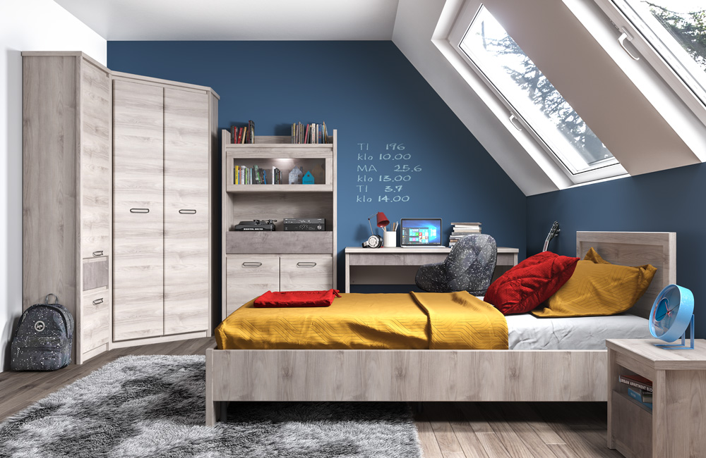 В набор мебели для детской Jazz 2 входит: Шкаф 2D1S, Шкаф угловой 2D, Шкаф с витриной 1V2D1S, Стол 3S, Кровать 120, Тумба прикроватная 1S. Коллекция JAZZ выполнена в современном стиле. Отличительной особенностью этой коллекции является одновременное применение двух вариантов открывания двери: при помощи металлических ручек на одних фасадах и внутренней фрезеровки на других. Фасады выдвижных ящиков могут быть выполнены как в цвете оникс, так и в цвете каштан найроби. Эта мебель станет заслуженным украшением для любого интерьера.