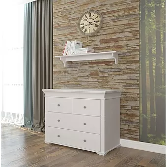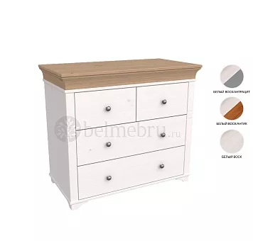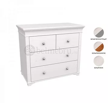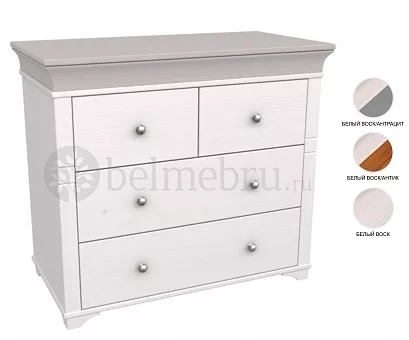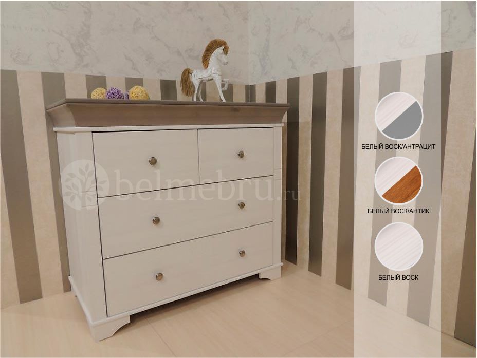 Комод имеет 2 малых ящика на шариковых направляющих и 2 больших ящика на роликовых направляющих, при окрашивании меняет цвет только верхняя столешница и карниз. Изделие выполнено полностью из массива сосны и является экологически чистым и допускается использование в детских учреждениях. Натуральное дерево во всех элементах. Отсутствует ДСП и заменяющие материалы. 100% массив дерева.