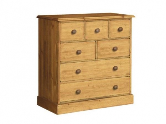 Комод выполнен из массива сосны, обладает легким ароматом смолы. Поставляется в собранном виде. Вес изделия 55 кг. Семь выдвижных ящика на деревянных полозьях. Комплектуется деревянными ручками "Грибок" (9шт.). Тон мебели может отличатся от фотографии на сайте. При желании можно приобрести кованные металлические ручки в форме кольца или груши.