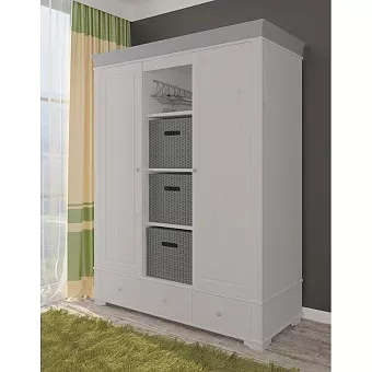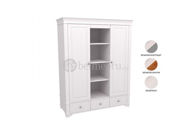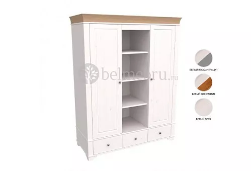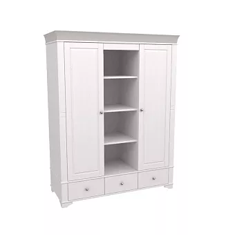 Шкаф имеет 3 отделения: правое и левое отделение с полкой и штангой под ней, среднее отделение имеет 3 полки, которые регулируются по высоте. Под каждым отделением имеется выдвижной ящик на роликовых направляющих. Дополнительно можно приобрести полки в левое или правое отделение.