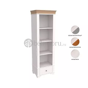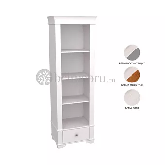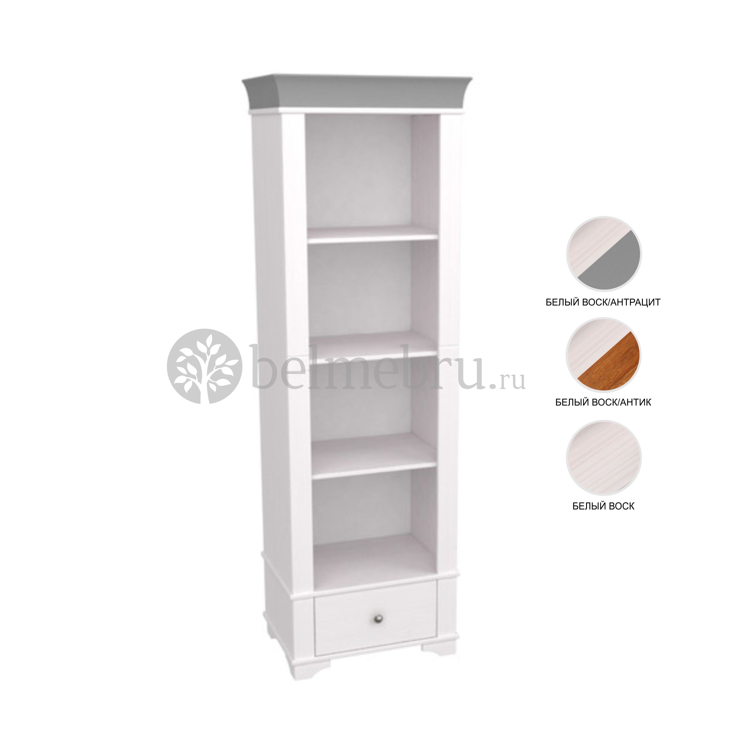Стеллаж имеет три полки и выдвижной ящик на роликовых направляющих. В варианте цвета окрашен карниз стеллажа. Изделие выполнено полностью из массива сосны и является экологически чистым и допускается использование в детских учреждениях. Натуральное дерево во всех элементах. Отсутствует ДСП и заменяющие материалы. 100% массив дерева.