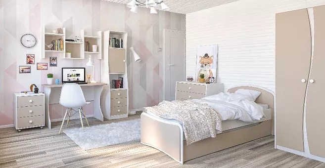Мебель для молодежной комнаты Комби изготовлена фабрикой Неман. Серия выполнена в приятных кремово-кофейных тонах, с сочетанием светлой фактуры дерева корпуса и матовых однотонных фасадов цвета «капучино», что добавит теплоты и уюта в Ваш интерьер. Дополнительный модуль - выдвижной ящик для