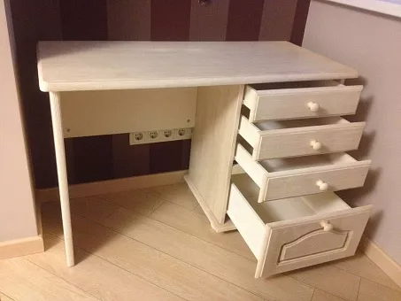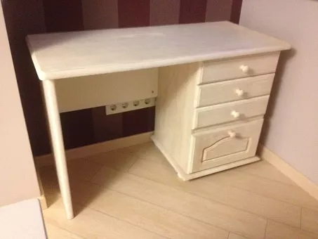 У нас три таких письменных стола,два из которых покупали на этом сайте.цвет браширование белый воск патина.остались довольны.для детей самое то:и симпатично и не дорого,ящики вместительные.