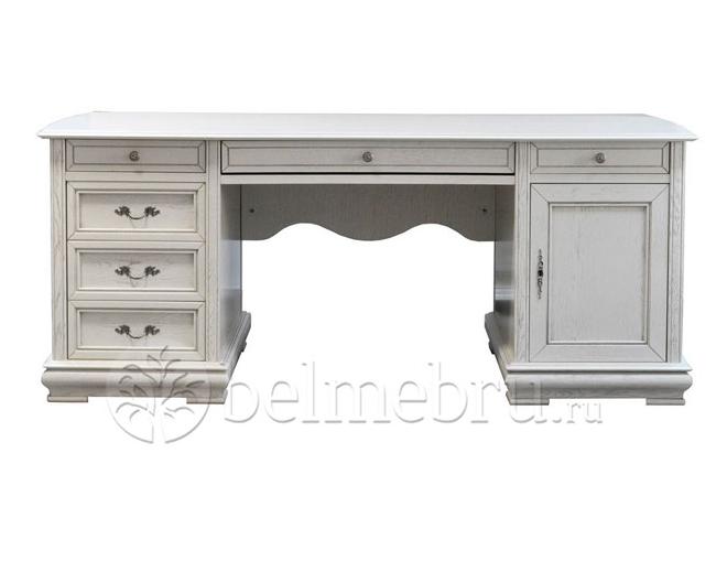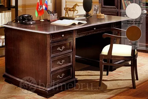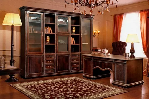 Набор для библиотеки – продолжение программы «Оскар». Те же изогнутые линии, искусные кружева, налёт старины на шкафах предназначенных для хранения книг, сувениров, альбомов и других дорогих для сердца вещей. Прекрасным дополнением идёт к шкафам письменный стол с широкой рабочей поверхностью, маня к себе многочисленными ящиками .
