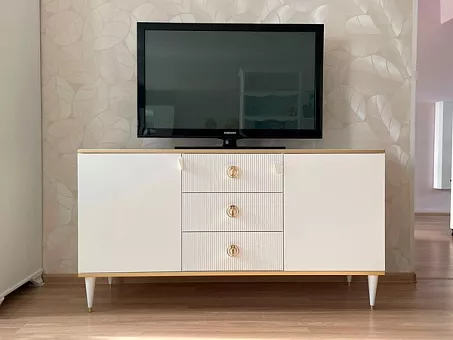 Комод для гостиной Глория выполнен из МДФ, в современном стиле. Крашения M11 (белый) и M18 (ваниль) с золотой или серебрянной патиной, но если патина серебро, то ручки только заказные за доплату. Шариковые направляющие BOYARD полного выдвижения, ящики из фанеры в лаке прозрачном. Дополнительно возможна установка с доводчиками. Ручки металлические. Возможно изготовление в нестандартном размере, подробности уточняйте у менеджеров.