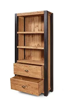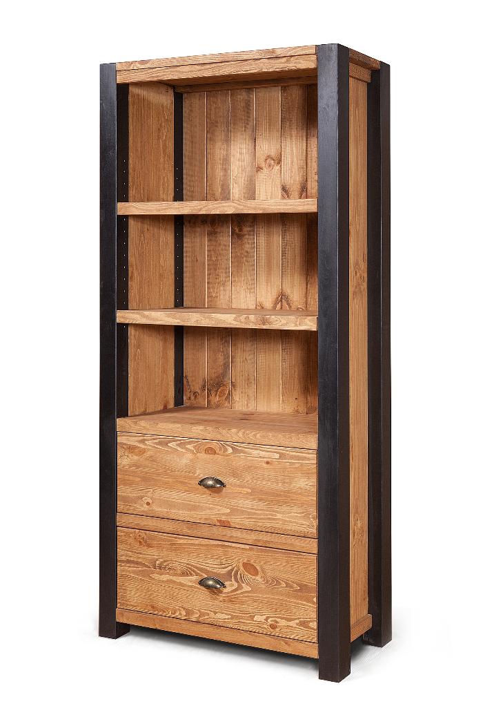 Шкаф выполнен из массива сосны. Имеет две открытые полки и два выдвижных ящика. Черным цветом - дерево под чёрным матовым лаком. В комплекте ручки "Ракушки", возможно изготовление без отверстий. Массив сосны. Задние стенки и донышки ящичков - наборная вагонка, сосна.