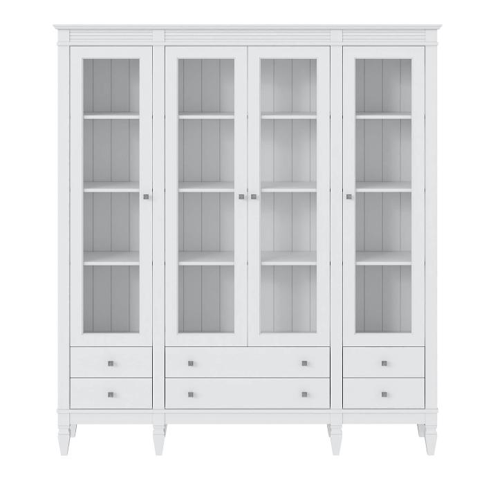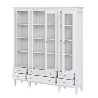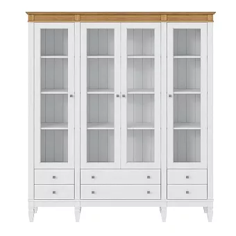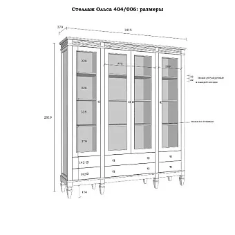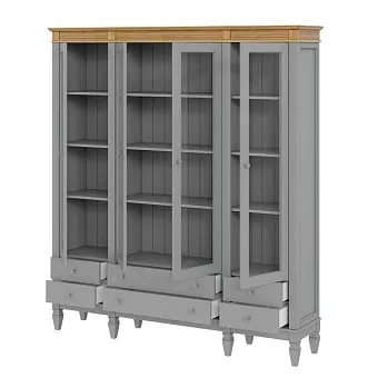 Большой и вместительный стеллаж «Ольса» - находка для просторной гостиной, библиотеки или кабинета. Здесь вы сможете разместить не только любимые книги, но и посуду и другие нужные вещи: при желании его можно дополнить комплектом навесных дверей. Визуально разделен на три вертикальных секции, в каждой из которых четыре полки за стеклянными дверями и 6 ящиков. Сделан из натурального массива, поэтому может выдерживать значительные нагрузки.