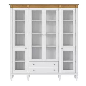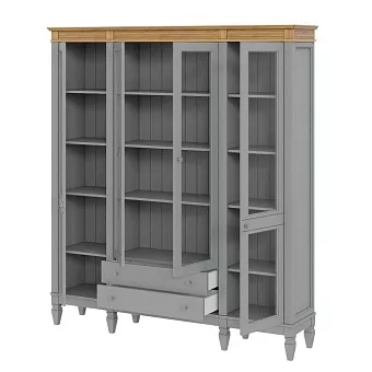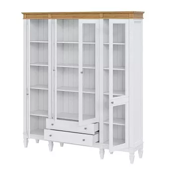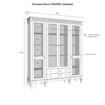 Большой и вместительный стеллаж «Ольса» - находка для просторной гостиной, библиотеки или кабинета. Здесь вы сможете разместить не только любимые книги, но и посуду и другие нужные вещи: при желании его можно дополнить комплектом навесных дверей. Визуально разделен на три вертикальных секции, в каждой из которых четыре полки за четырьмя стеклянными, распашными дверьми и два широких ящика. Сделан из натурального массива, поэтому может выдерживать значительные нагрузки.