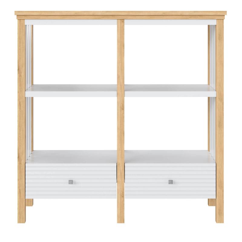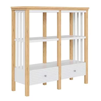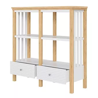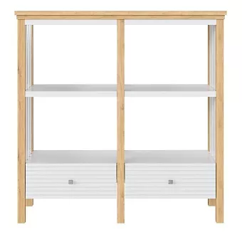 Стеллаж оснащен одной длинной полкой и двумя выдвижными ящиками. Направляющие на ящиках с доводчиками. Высокие ножки обеспечивают оптимальный доступ при уборке.