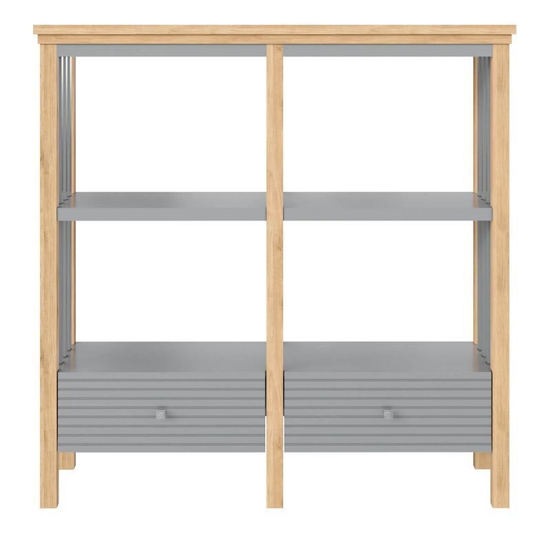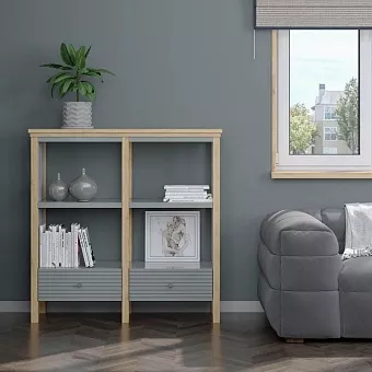Стеллаж оснащен одной длинной полкой и двумя выдвижными ящиками. Направляющие на ящиках с доводчиками. Высокие ножки обеспечивают оптимальный доступ при уборке.