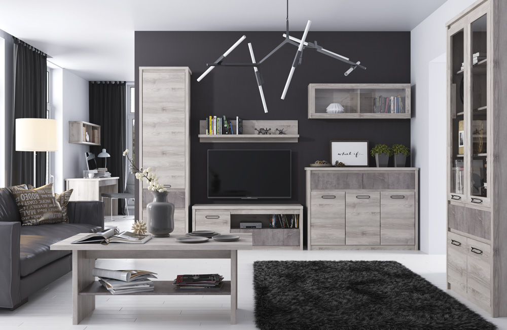 В набор мебели для гостиной Jazz 2 входит: Шкаф с витриной 2V2D1S, Полка навесная 1V, Полка навесная 3N, Полка навесная Т, Тумба 3D2S, Шкаф 2D1S, Стол журнальный, Стол 3S. Мягкая мебель и декор в набор не входит. Коллекция JAZZ выполнена в современном стиле. Отличительной особенностью этой коллекции является одновременное применение двух вариантов открывания двери: при помощи металлических ручек на одних фасадах и внутренней фрезеровки на других. Фасады выдвижных ящиков могут быть выполнены как в цвете оникс, так и в цвете каштан найроби. Эта мебель станет заслуженным украшением для любого интерьера.