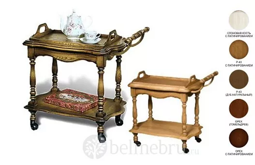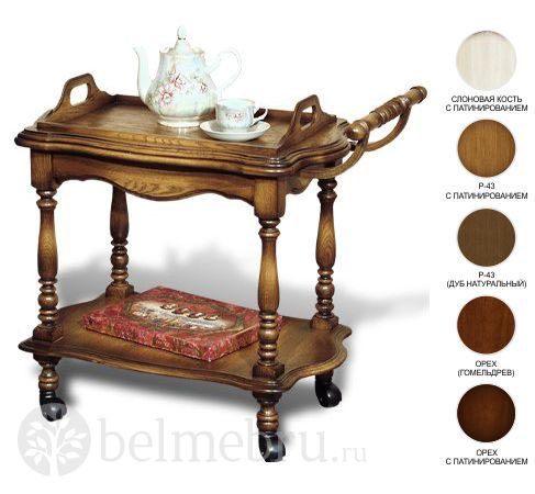 Стол имеет сьемный деревянный поднос. Очень удобно для использования.Мебель серии Версаль изготавливается из массива дуба с ручной резьбой по дереву. Поставляется в четырех цветах: дуб натуральный, дуб с патинированием, орех, слоновая кость с патинированием. Все изделия изготавливаются под заказ в течении 30 рабочих дней. Поступает в разобранном виде.