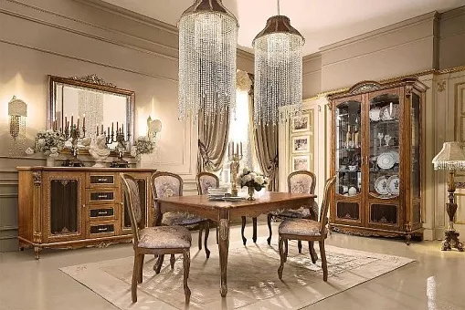 прямых линиях, а также большим количеством сложных декоративных деталей в виде «короны» декоративных опор и пилястр. Украшением мебели служат элементы резьбы, инкрустации, имитация позолоты.