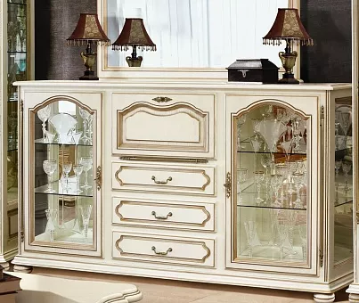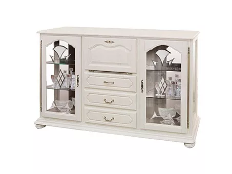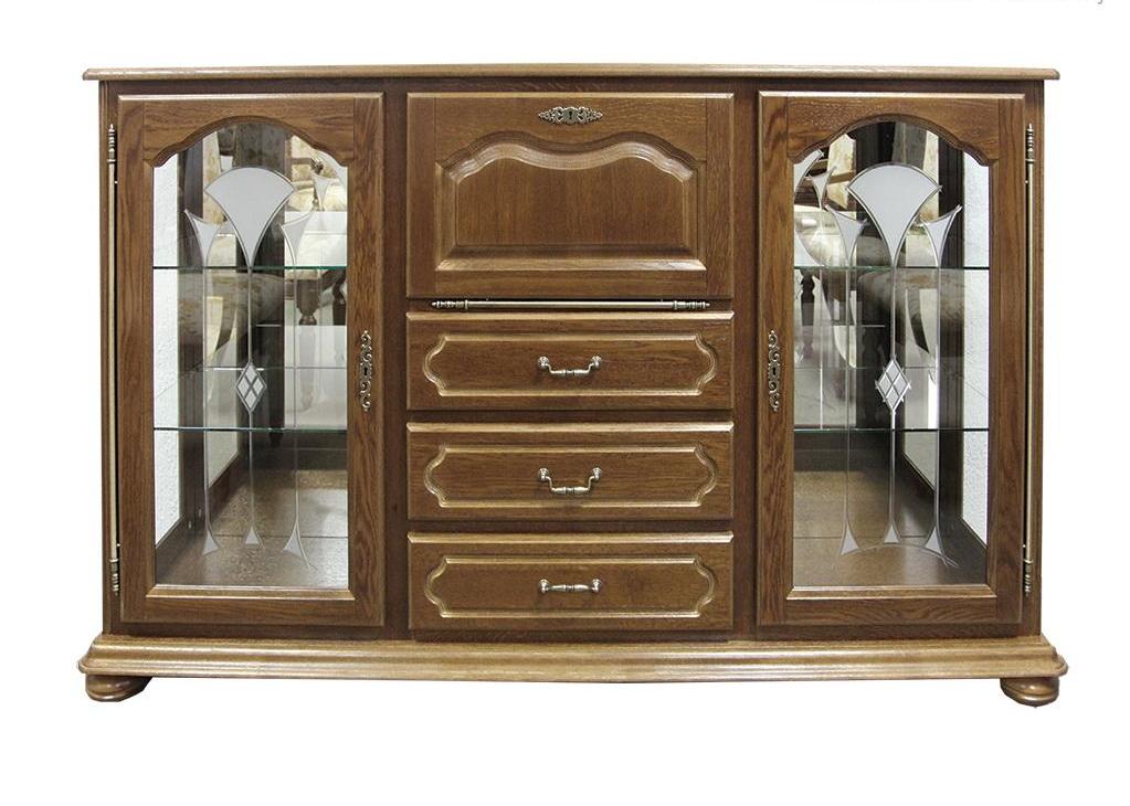 Классический вариант высокохудожественного изделия, символа престижа и процветания своего владельца. В изделиях использован массив древесины дуба, энергетические и лечебные свойства которого известны давно. Это мебель для покоя и мира в семье – ничто нигде не разбросано, проблем с порядком в доме нет. Мебель, способная в одночасье решить проблемы даже самой небольшой квартиры. В состав набора входят тумбы различного функционального назначения, шкафы с витриной, шкаф для одежды, столы обеденный и письменный, шкафы для книг, кресло и стул, что позволяет обставить различные комнаты – гостиную, кабинет, столовую, прихожую в едином стиле. Стеклянные филёнки в витринах с рисунком, что придаёт изделию лёгкость и неповторимость. В тумбе ММ-126-34 за откидной дверью находится барное отделение со стеклянной полкой и зеркальной задней стенкой.