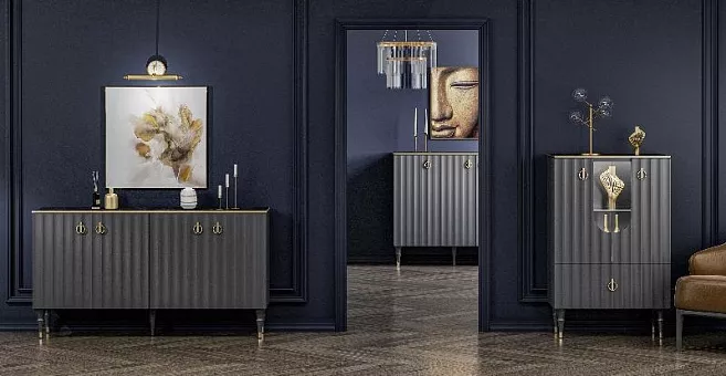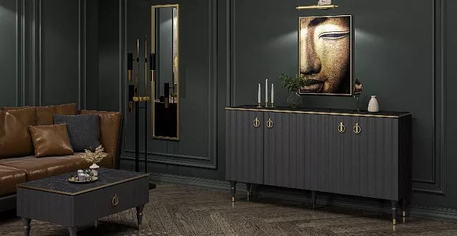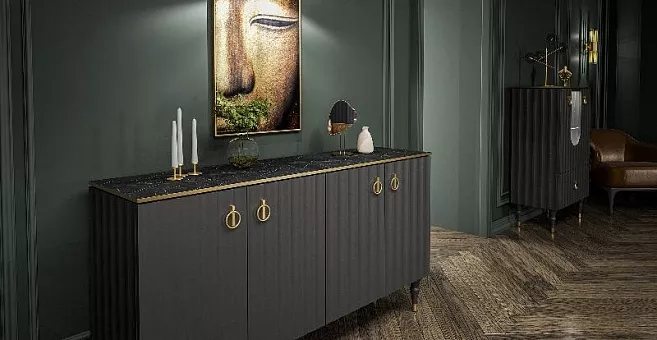 Коллекция мебели Лоренсо – это изысканный дизайн, подчеркнутый золотой металлической линией на изящной столешнице Мрамор Неро Маркина.