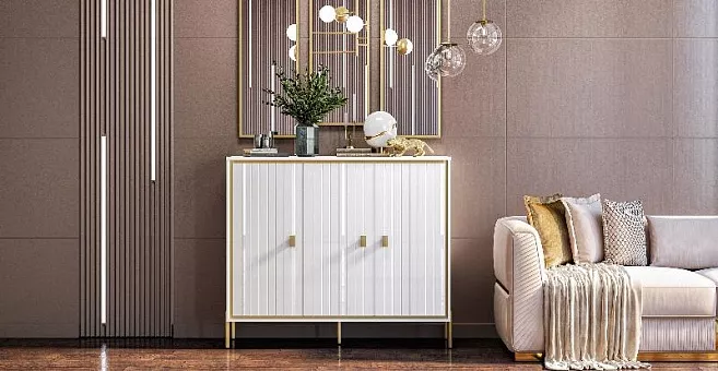 глянца, зеркальных отражений и приглушённого чарующего сияния металла. Строгая геометрия форм смягчена игривым характером золотой фурнитуры и легкостью