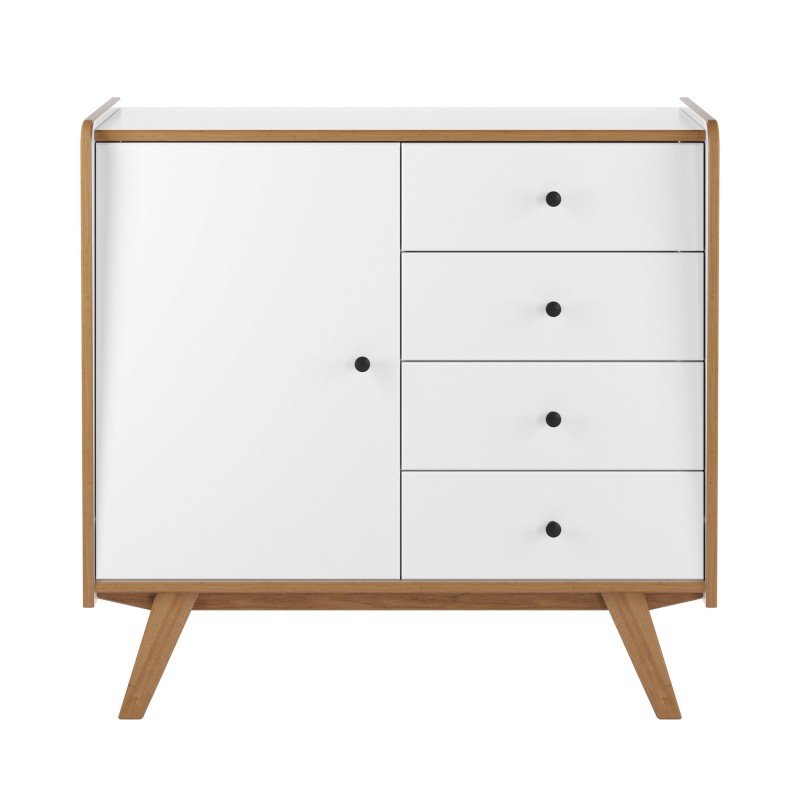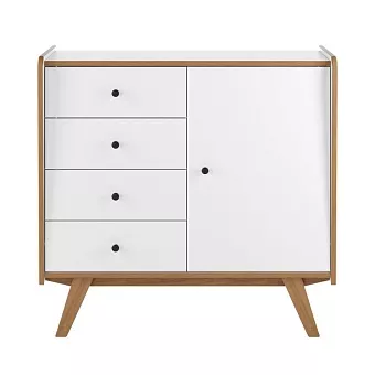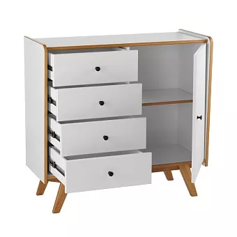 Коллекция "Винтаж" представлена предметами спальни и подростковой комнаты. Производится из массива сосны в трех цветовых вариантах: белый лак, белый лак/браун, серый лак/браун. В варианте белый лак/браун и серый лак/браун в коричневый цвет окрашены торцы корпуса, торцы внутренних полок, ножки предметов. Основная особенность коллекции - окраска плоских поверхностей происходит вальцовым методом, материалами ультрафиолетового отвердения. При таком способе нанесения краски покрытие получается идеально ровным, структура дерева почти не видна. Выдвижные ящики коллекции на шариковых направляющих с доводчиками закрывания. Петли дверей также с доводчиками закрывания. Боковины и задняя стенка выдвижных ящиков окрашены в цвет корпуса. Тумба Винтаж 1 дверь 4 ящика белый лак/браун: комод имеет 4 ящика на шариковых направляющих с доводчиками и 1 дверку. За дверкой расположена полка. Петли дверки с доводчиками. Покрытие - укрывистый, структура древесины почти не просматривается. Выдвижные ящики на направляющих полного выката с доводчиками.