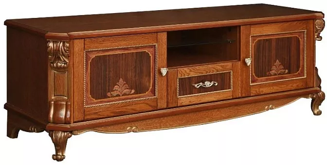Тумба "Альба ТВ2с" П 485.02с палисандр (с зол., с сер.) фабрики Пинскдрев в классическом стиле характерна массивность, основательность и пышность форм. Альба является классическим примером мебели из массива дуба. Она включает в себя мебель для