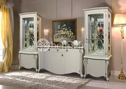 Плавные линии, изгибы, профильные поверхности придают набору лёгкость, очарование эпохи прошедших веков, при этом оставаясь удобным и практичным. Вместительные витрины, комоды не разочаруют, столовая группа из стола и стульев словно приглашает провести вечер при свечах. Изделия имеют несколько цветовых решений: классический благородный — «коньяк», нежный , утончённый – «белая эмаль с серебряной патиной» и неординарный, удивительный – «кракелюр».