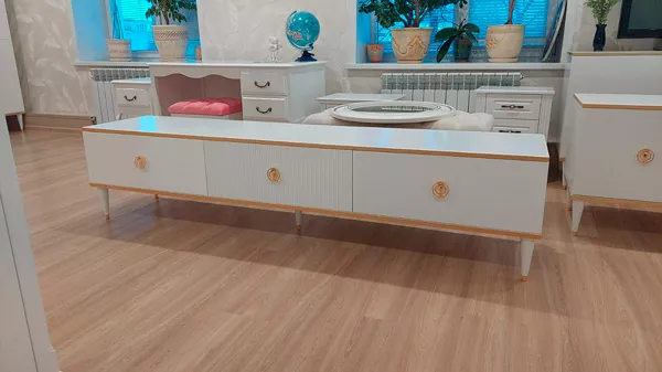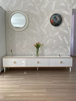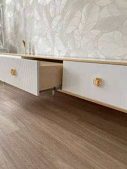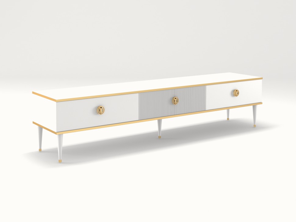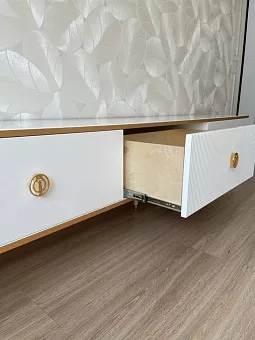 Тумба ТВ Глория 3 ящика выполнена из МДФ, в современном стиле. Крашения M11 (белый) и M18 (ваниль) с золотой или серебрянной патиной, но если патина серебро, то ручки только заказные за доплату. Шариковые направляющие BOYARD полного выдвижения, ящики из фанеры в лаке прозрачном. Дополнительно возможна установка с доводчиками. Ручки металлические. Возможно изготовление в нестандартном размере, подробности уточняйте у менеджеров.