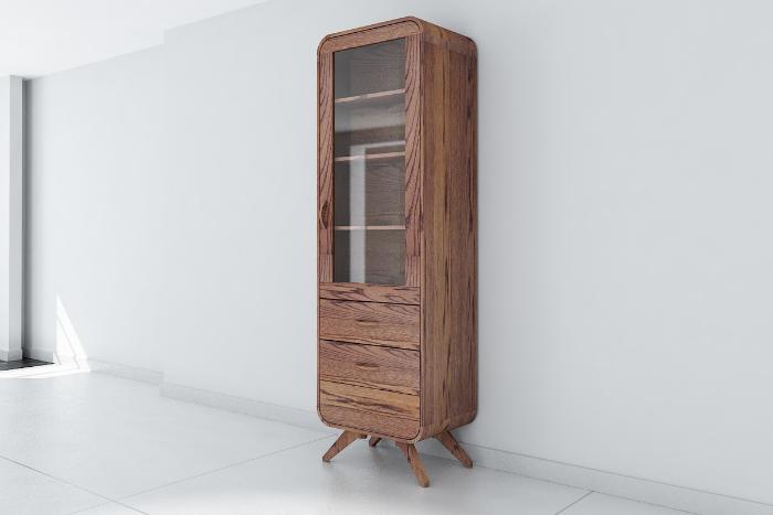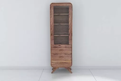 За стеклянной дверью три полки, в середине выдвижной ящик, внизу дверь, за которой две полки Производство: Россия Материал: массив дуба Отделка: морилка, масло. Форма поставки: в собранном* виде Вес (кг):65,00 Объем (м.куб.): 0,56, Количество пакетов: 1 Габариты (ширина*глубина*высота):650*450*2080 Коллекция мебели Aachen (Аахен) из цельноламельного массива дуба для спальни и гостиной. Стиль авангард. Двенадцать предметов. Особенность дизайна данной коллекции – радиусные элементы R90 мм в угловых соединениях и ручках.На мебель устанавливаются петли и шариковые направляющие с плавной доводкой. Есть возможность изготовления по индивидуальным размерам заказчика.