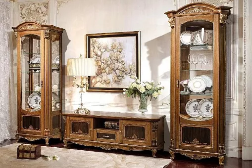 Шкаф с витриной "Альба 8" П 485.08-01 палисандр (с зол., с сер.) фабрики Пинскдрев в классическом стиле характерна массивность, основательность и пышность форм. Альба является классическим примером мебели из массива дуба. Она включает в себя мебель для