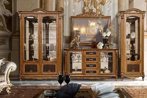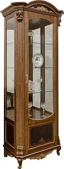 Шкаф с витриной "Альба 8" П 485.08 палисандр (с зол., с сер.) фабрики Пинскдрев в классическом стиле характерна массивность, основательность и пышность форм. Альба является классическим примером мебели из массива дуба. Она включает в себя мебель для