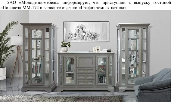 Программа изделий «Полонез» разительно отличается оригинальным дизайном, обилием стекла и света, что соответствует последним веяниям моды. Фасад из натурального массива бука. В витринах использована искусственная подсветка. В тумбах ММ-174-21 и ММ-174-22 за откидной дверью находится барное отделение со стеклянной полкой и зеркальной задней стенкой.