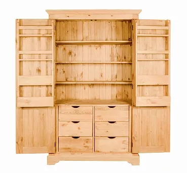 Шкаф для посуды ФАР-125 выполнен из массива сосны, обладает легким ароматом смолы. Поставляется в собранном виде. Вес изделия 120 кг. Три фиксированные полки, шесть ящиков. Ручки деревянные "Грибочек" (2 шт.). Тон мебели может отличатся от фотографии на сайте. При желании можно приобрести кованные металлические ручки в форме кольца или груши.