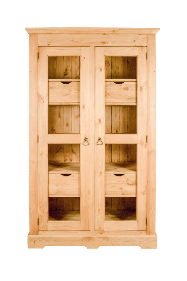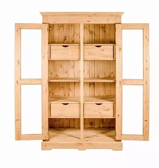 Шкаф для посуды ФАР-3 выполнен из массива сосны, обладает легким ароматом смолы. Поставляется в собранном виде. Вес изделия 100 кг. Две фиксированные полки, четыре выдвижных ящика. Ручки деревянные "Грибочек" (2 шт.). Тон мебели может отличатся от фотографии на сайте. При желании можно приобрести кованные металлические ручки в форме кольца или груши.