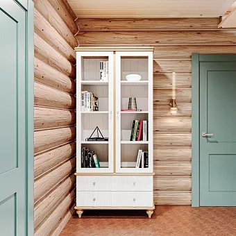 Представляем шкаф для посуды «Рандеву» 22 из массива сосны и стекла. Представляет собой высокий шкаф с распашными, стеклянными дверями. Снизу два широких, выдвижных ящика.