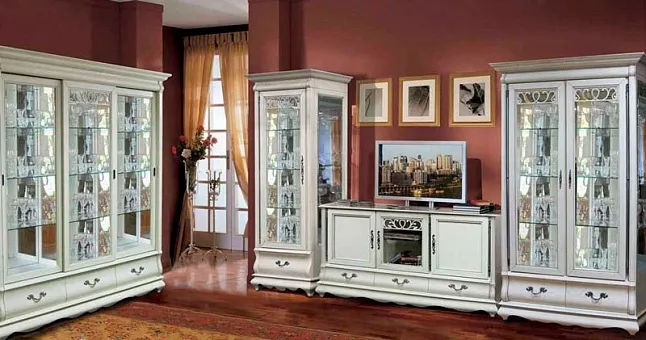 Изогнутые линии, искусно вырезанное кружево из дерева, налёт старины, подсветка, боль-шой модульный ряд, придают набору изысканность, аристократизм.