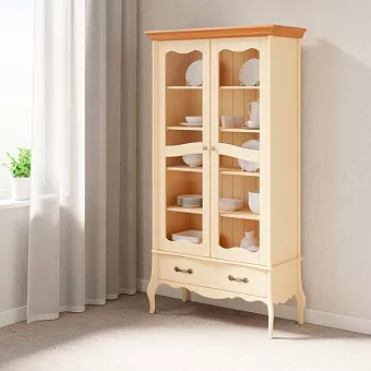 Витрина с 2 дверями и ящиком из массива сосны. Покрытие - укрывистый бежевый воск или бежевый воск/антик, в антик выкрашен карниз. Структура древесины почти не просматривается. Витрина имеет 4 полки, регулируемые по высоте и один выдвижной ящик на направляющих Blum с доводчиками. Задняя стенка витрины выполнена из вагонки.