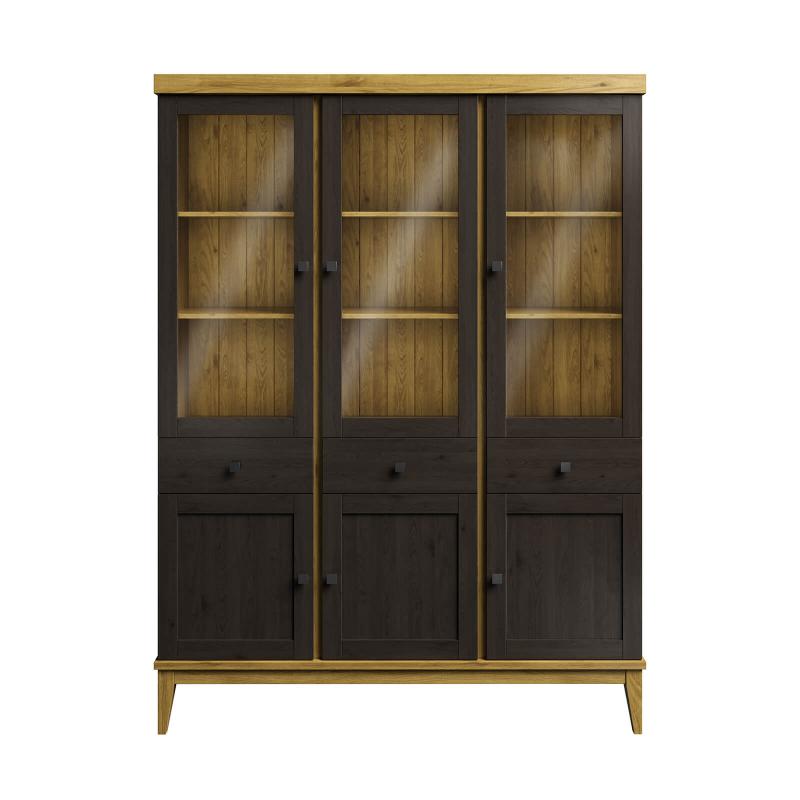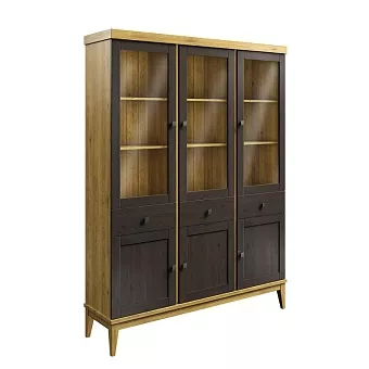 Представляем шкаф для посуды «Бон Вояж» 333 из массива сосны и стекла. Представляет собой высокий шкаф сверху тремя распашными, стеклянными дверями, снизу тремя филенчатыми дверками и тремя выдвижными ящиками в середине.