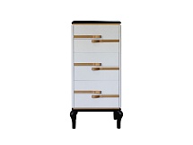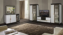 В этом наборе соединились классика и современность. Прямые линии фасадов подчёркивают изящество ножек и резного карниза. Привлекает и создаёт уют отсутствие острых граней: кромки боковин, крышек и карнизов скруглены.