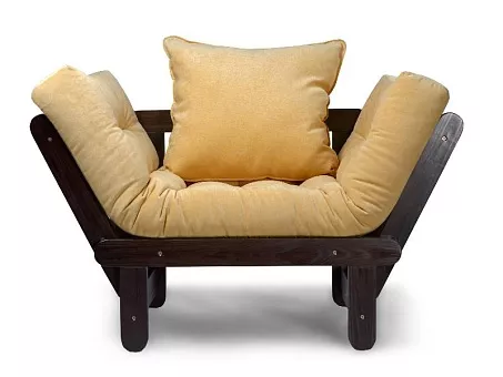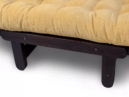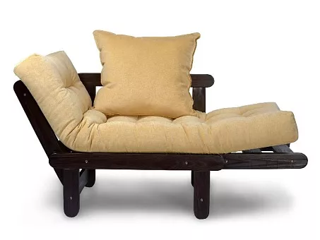 Данная модель выполнена в оригинальном виде из массива дерева с откидными подлокотниками, мягким матрасом и приспинной подушкой.