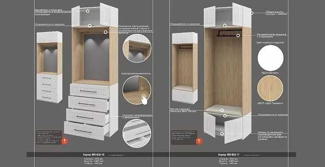 Модульная система Отис – это идеальный вариант для хранения одежды, обуви и аксессуаров. Два вместительных шкафа шириной 80 см позволят разместить все необходимое, глубина 45 см. сэкономит пространство. Вариативность внутреннего наполнения, дополнительных панелей и разнообразных фасадов поможет составить индивидуальный проект с помощью серийной мебели от фабрики Неман. Специально для серии шкафов Отис разработаны дополнительные боковые панели в цвет фасадов шкафа. При необходимости такую панель можно установить на открытый торец изделия для создания единой цветовой гаммы гардероба или прихожей. Также панели рекомендуется использовать при стыковке модулей разной глубины. Материал:Линейка шкафов ОТИС предлагает 9 вариантов исполнения фасадов. Техническая информация: Материал корпуса: плита ЛДСП, цвет Белый, Дуб Прованс. Материал фасада: плита МДФ, ЛДСП. Кромка: пластик. Система выдвижения: скрытого типа с доводчиком Hettich. Фурнитура: петли с доводчиком GTV. Вешалка металлическая: цвет черный матовый. Ножки: с возможностью регулировки по уровню Gico. Ручки на выдвижных ящиках: металлические, цвет - шлифованная сталь. Верхние и нижние фасады открываются от нажатия (Push-to-Open). Подсветка светодиодная (холодный спектр).