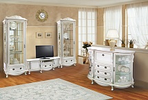 Гнутая рамочная конструкция фасадов подчёркивается «косичкой» выполненной на цельной древесине, методом горячей накатки. Вертикальные декоративные бруски из массива дуба, с резьбой выполненной ручным способом, поэтому каждый набор является уникальным и неповторимым.