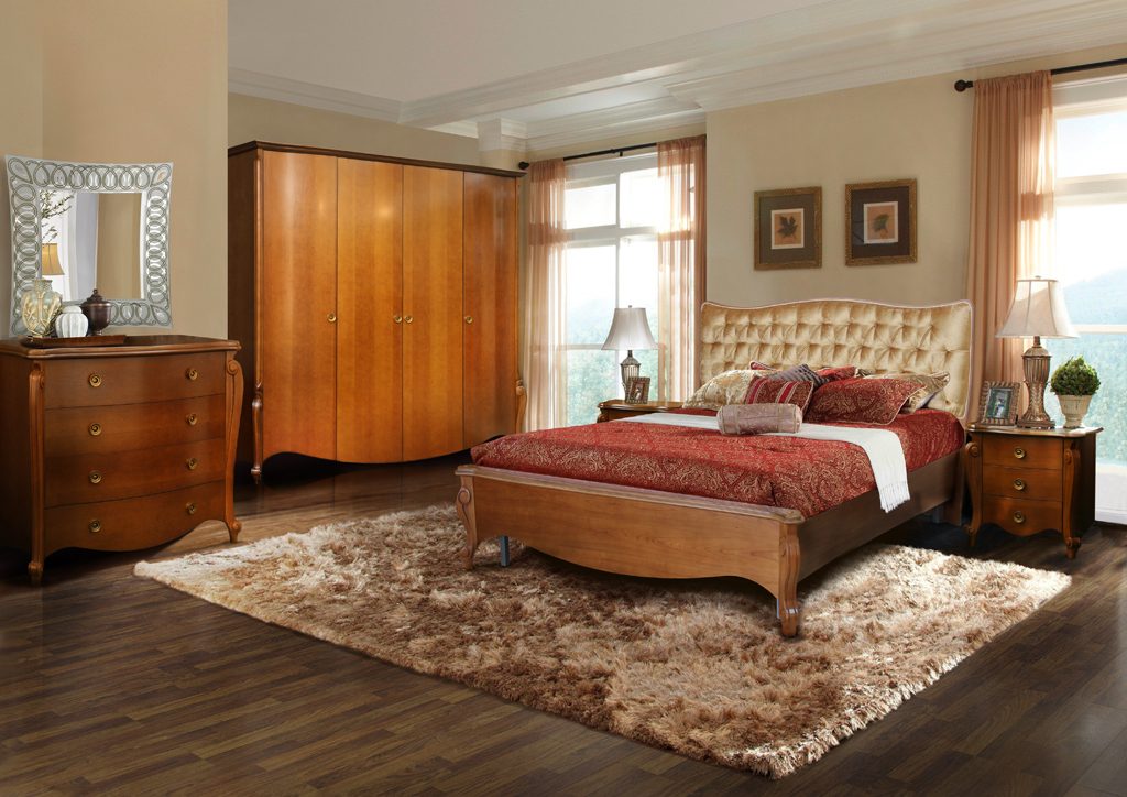 Плавные линии, изогнутые поверхности, изящные ножки придают спальне утончённость и женственность. Кровать манит к себе мягкой спинкой, очаровывает и не отпускает. Изящный туалетный столик с секретом, когда часть крышки лёгким движением руки становится зеркалом. Изделия имеют несколько цветовых решений: классический благородный — «коньяк», нежный, утончённый – «белая эмаль с серебряной патиной».